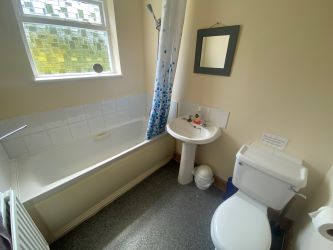 With suite comprising panelled bath in part tiled surround with mixer tap and shower attachment over, pedestal wash basin and WC. Radiator.