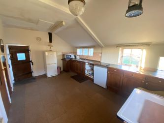 With windows on the gable and rear elevation providing plenty of light and good views of the garden. Range of cupboard and drawer units with worksurface over incorporating a circular stainless steel sink with mixer tap and circular drainer. Four ring electric hob with recess under. Exposed wall timbers. Range of built-in storage cupboards (one of which contains the hot water tank) and door to Utility Cupboard with plumbing and waste connections for a washing machine. Night storage heater and access to roof space. Part glazed wooden door providing access to the gardens and grounds. Ceiling height - approx. 2.62m.