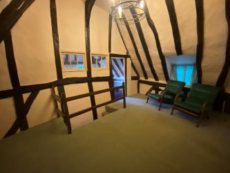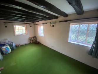 With delightful dormer windows on the front and rear elevation overlooking the gardens, grounds and churchyard. Vaulted ceiling with exposed roof truss elements. Exposed wall timbers. Ceiling height - approx 2.77m maximum. Doors off to