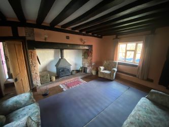 A spacious reception room with leaded light window overlooking the front garden together with additional window on the rear elevation providing wonderful views of the church and gently undulating countryside beyond. The focal point of the room is the fireplace with impressive bressummer beam over containing the Villager woodburning stove set on a raised tile and brick hearth. Ceiling height - approx. 2.23m. Exposed ceiling and wall timbers, wall light points, boarded floor and door through to the