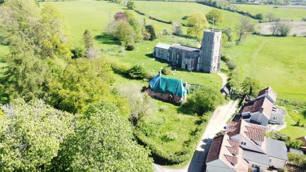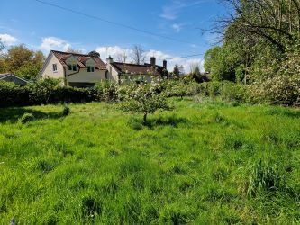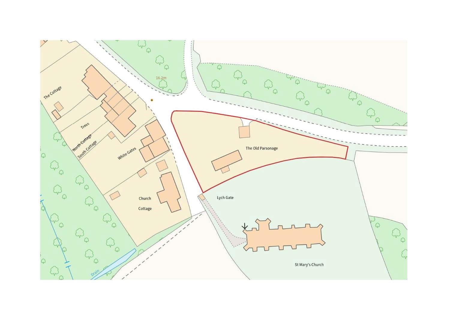The Old Parsonage occupies a generous, triangular shaped plot, and with vehicular access from Hall Road that leads to the timber framed garage, approximately (6.11m x 3.68m), and with personnel door to the rear and lean-to shed to the side. Beside the driveway is a double gate, and this opens onto a pathway that leads to the covered porch and front door, together with a door serving the kitchen/breakfast room. The front garden has been unattended for some time and is laid to grass, but interspersed with a number of mature and established trees, including fruit bearing trees, enclosed within brick and flint walling. The pathway continues along the south-western gable to the property where there is a second pedestrian gateway that links with a public footpath. There is a modest area of garden immediately to the rear of The Old Parsonage, separated from the churchyard via a newly planted hedgeline. The remaining gardens and grounds are located to the east, and again are mainly laid to grass, and partly enclosed within established hedging. To the very rear of the garden is a small brick and pantile outbuilding. In all, the gardens and grounds extend to approximately 0.39 acres (0.16 ha).