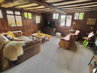 A charming sitting room steeped in history. This cosy space features oak panelling that adds character and warmth. Beautiful Tudor-style windows on the side and rear offer picturesque views of the surrounding landscape, blending the indoors with the outdoor scenery. A central fireplace with an inset woodburning stove serves as the heart of the room, providing warmth and a focal point. This sitting room seamlessly blends historic charm with modern comfort, creating an inviting and unique space.
