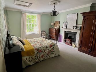 This generously sized master bedroom is both spacious and elegant, with ample space for a king-sized bed and additional furniture. The built-in wardrobe provides practical storage and a large sash window at the front allows plenty of natural light and offers charming views over Dedham High Street and St Mary's Church. The room combines traditional and modern decor, featuring a marble fireplace that adds warmth and character