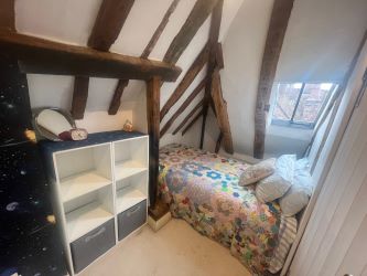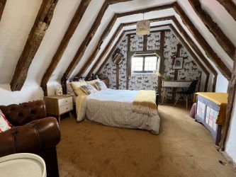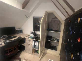 A charming space featuring vaulted ceilings with exposed wooden beams and Velux-style window. Perfect for a single bed and compact office setup, complete with built-in storage cupboard.