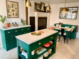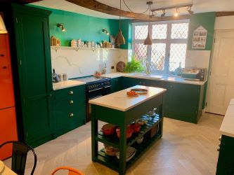 This light and airy space features a large window on the gable elevation, offering delightful views into Brannam Court. The newly fitted, handmade bespoke kitchen boasts striking forest green units and includes a dishwasher, a washing machine, a freestanding island, a sink, and space for a Range-style cooker and refrigerator. Additional built-in units provide ample storage, and there is plenty of room for a dining table. A door leads to the rear courtyard.