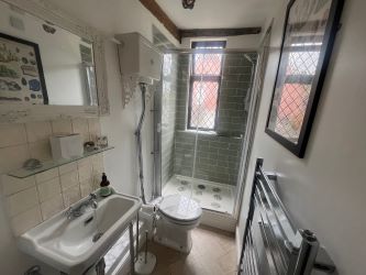 A stylish and modern suite, recently installed comprising WC, hand wash basin and shower. Two windows to rear and side aspect and cupboard housing modern condensing Worcester gas fired combi-boiler and Hive heating system.