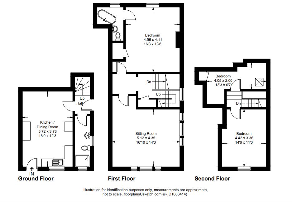 Ground Floor: entrance hall, kitchen/dining room and shower room. First Floor: sitting room, landing and double bedroom with en-suite bathroom. Second floor: second double bedroom with landing and single bedroom/office. Exterior: off road parking for two vehicles.