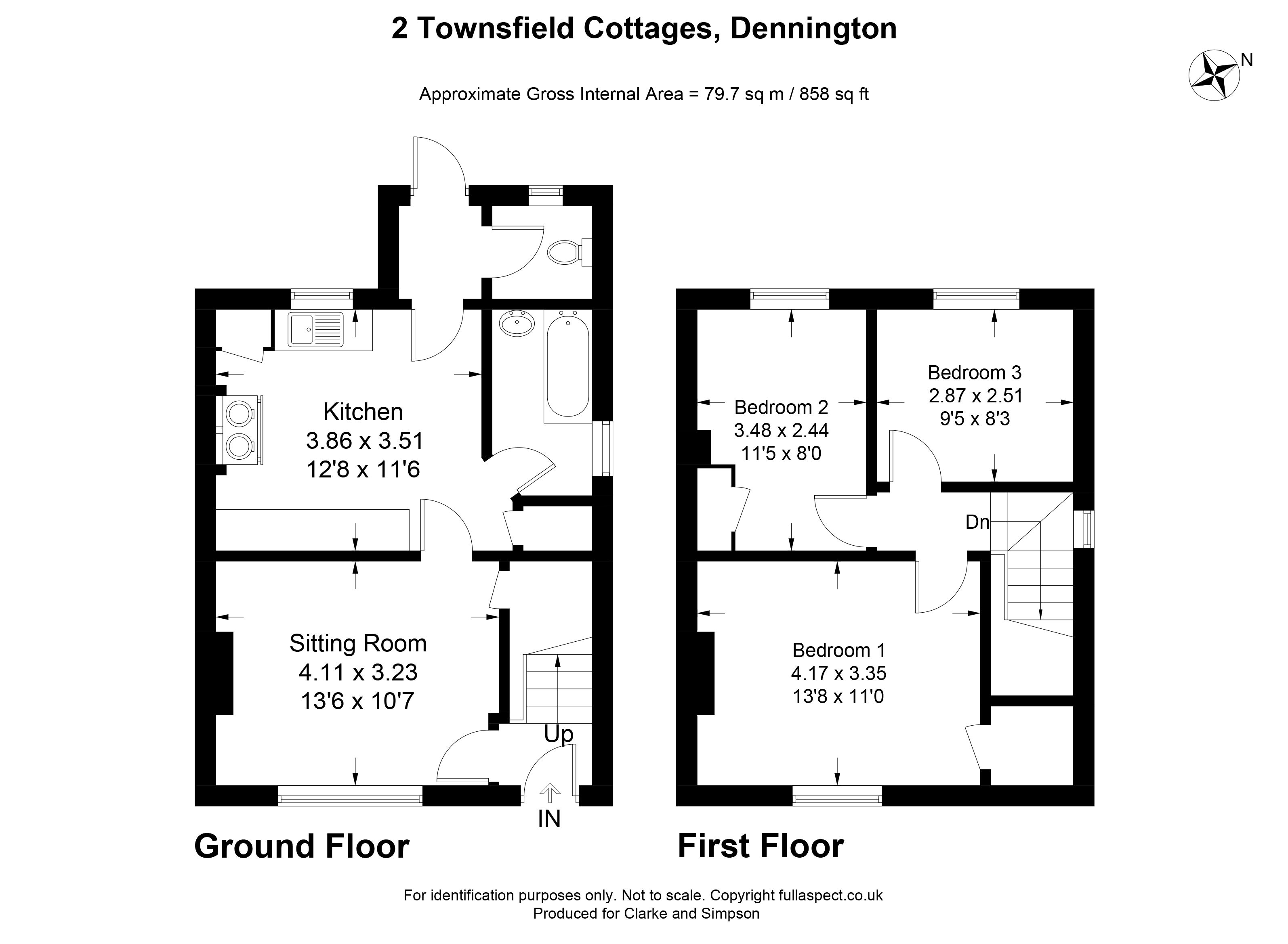 2 Townfields Cottages is a semi-detached red brick dwelling in need of general modernisation. It has some UPVC double glazed windows and night storage heaters. A front door leads to a hallway, where there are stairs to the first floor landing. Off this is a sitting room with a fireplace, a window overlooking the front garden and an understairs cupboard. A door leads to the kitchen, which has basic high and low level fitted units and a stainless steel sink unit with taps over, pantry cupboard and Rayburn, as well as a night storage heater. Off the kitchen is a bathroom, comprising a bath and hand wash basin. At the rear of the house is a hallway and cloakroom. From the first floor landing there are three bedrooms, the principal bedroom has a built-in wardrobe, a fireplace, window to the front and a night storage heater. The second bedroom can be used as a double and has an airing cupboard with hot water cylinder and slatted shelving. The third bedroom completes the accommodation and is a good sized single bedroom.