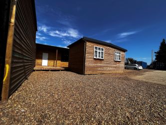 Of steel portal frame construction under a concrete profile sheeting roof with timber cladding to all elevations. Two open bays to front. Extending to approximately 470m2.