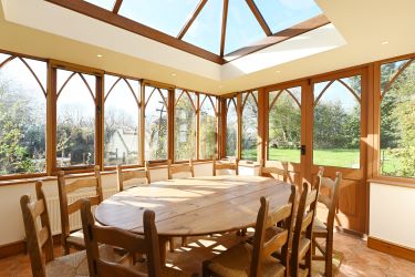 14'2 x 10'6 (4.32m x 3.2m maximum) An orangery style room which is ideal as a dining room. Rooflight and wall to wall windows to the south and west. French doors to the exterior. Recessed spotlighting. Built in cupboard.