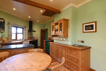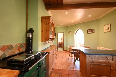 22'10 x 11' (6.96m x 3.35m maximum) High and low level wall units with wood block and granite work surfaces. Rayburn stove also serving the central heating and hot water. Radiator. Recessed spotlighting. Doors lead to the garden room, study and hallway.