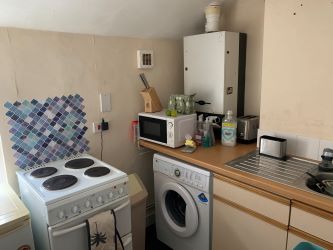 8' x 6'4 (2.44m x 1.93m) Low level wall units with work surface and stainless steel sink with drainer and mixer taps above. Space and plumbing for washing machine, electric oven and fridge. Wall mounted gas fired combi-boiler. Radiator.