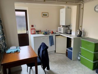 13'7 x 9'4 (4.14m x 2.84m) The kitchen area is fitted with low level wall units with a roll edge work surface, stainless steel sink with drainer and mixer taps above. Space for fridge. Wall mounted gas fired combi-boiler. South facing window. Radiator. A door opens to the