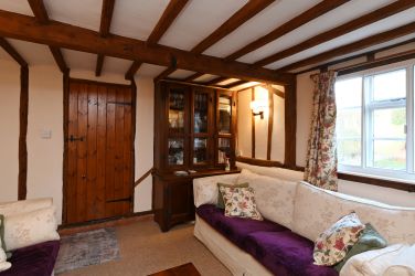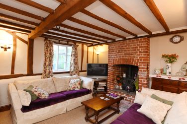 East facing window with secondary glazing. Exposed timbers and brick fireplace with multi-fuel stove. Radiator. Steps lead down to the