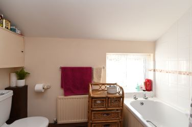 South facing window with secondary glazing. Bath with shower above, WC and hand wash basin. Striplight with shaver point. Radiator.