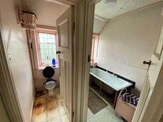 Partly sub-divided and with suite comprising panelled bath, pedestal wash basin and WC with high level cistern.